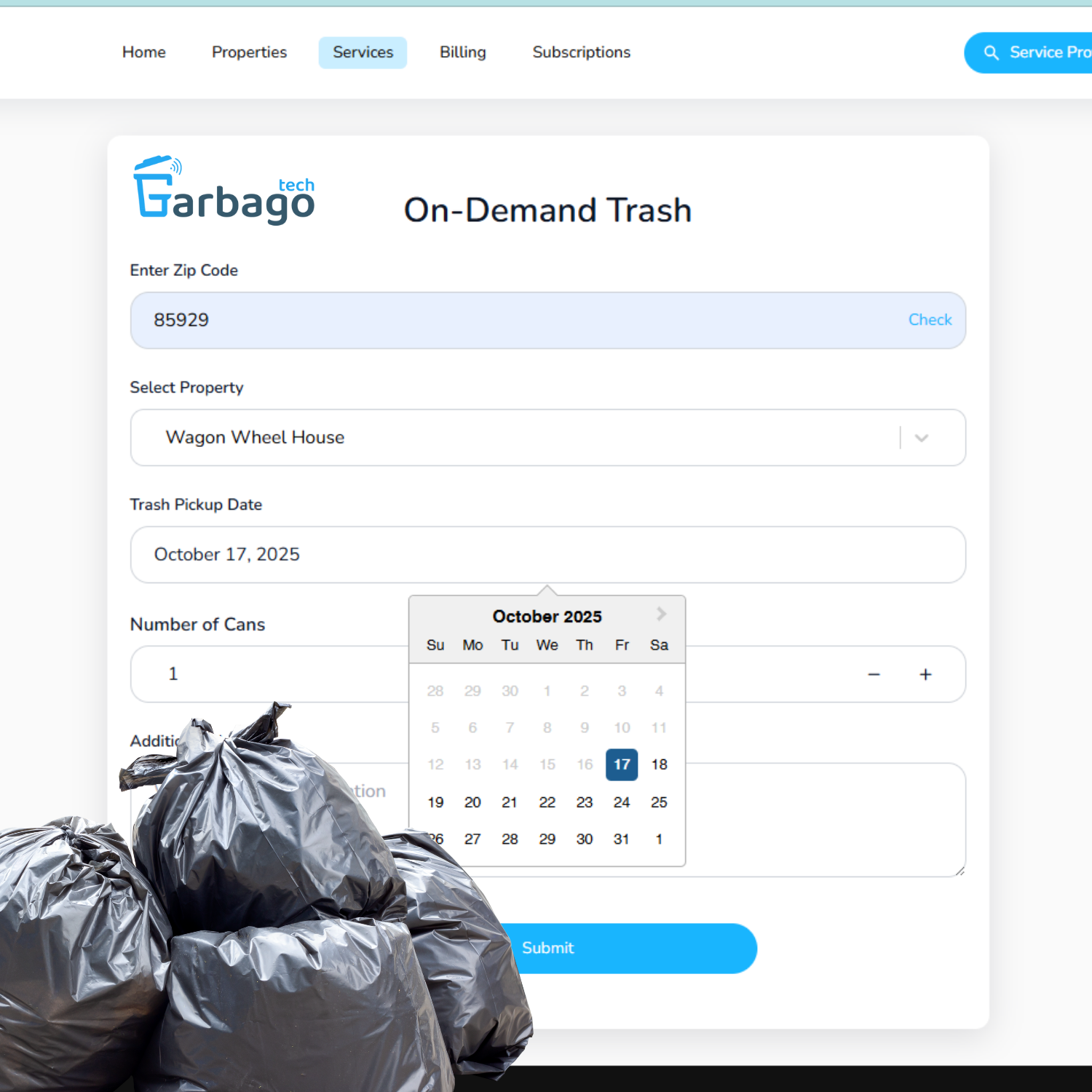 Turnovers don’t always line up with trash day — and overflowing bins or extra bags can become a problem fast. That’s where Garbago comes in. Our platform connects you with dependable local pros ready to respond when you need them, providing flexible, on-demand trash pickup without the headaches of traditional scheduling.
